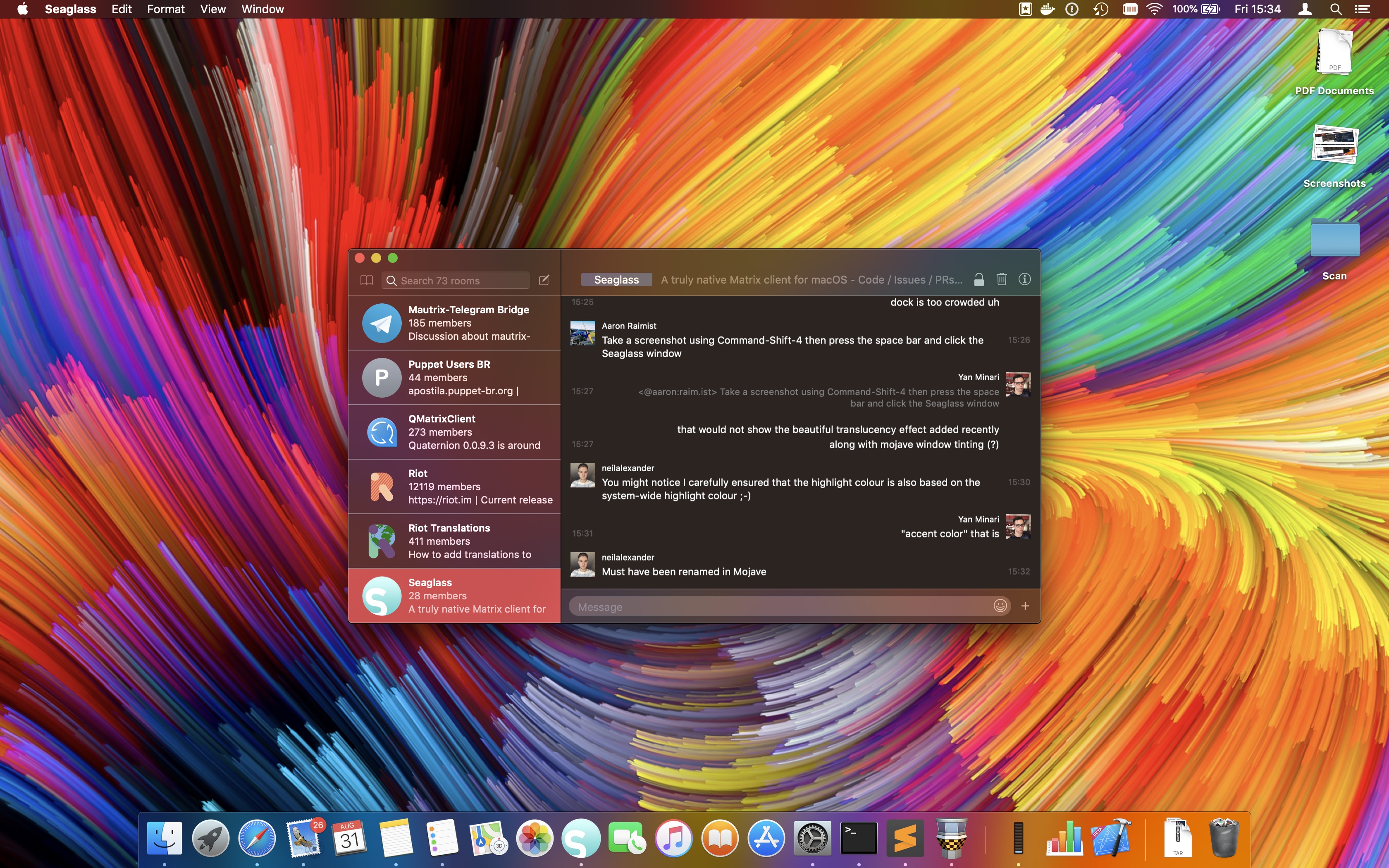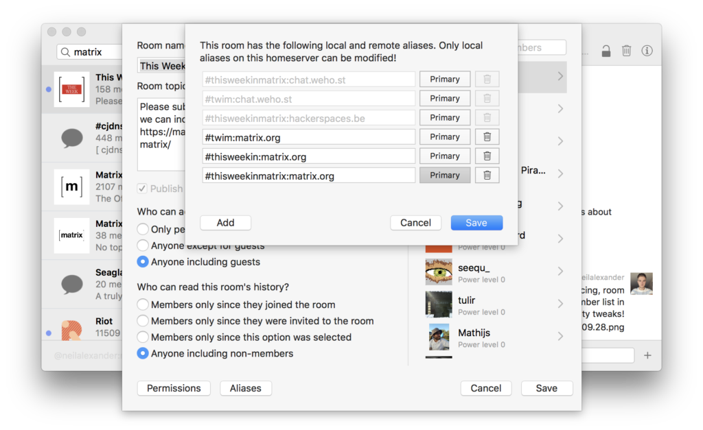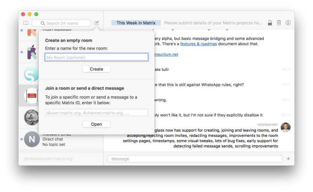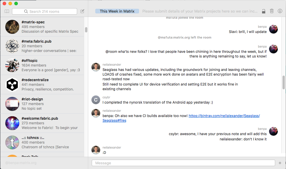 Lots of discussion about this project, specifically the question of how to efficiently render Rich Text. macOS does not make this easy, so a solution being considered is to use a WebKit for room rendering: