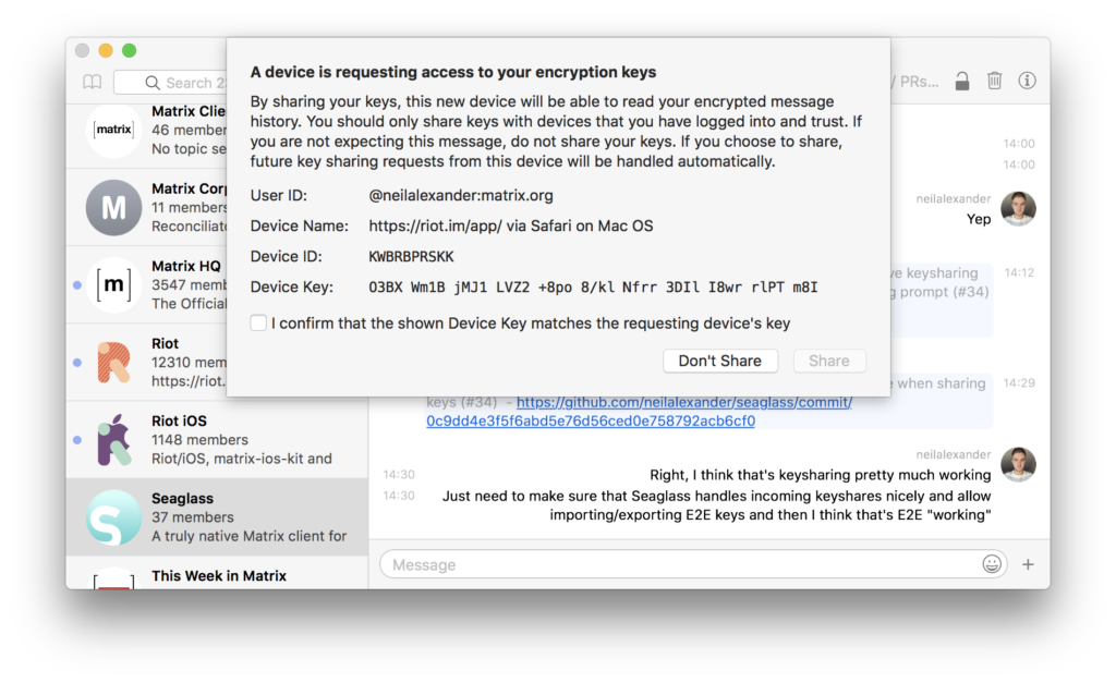 - Lots and lots of E2E implementation work in general; backups, cross-signing, and verification.