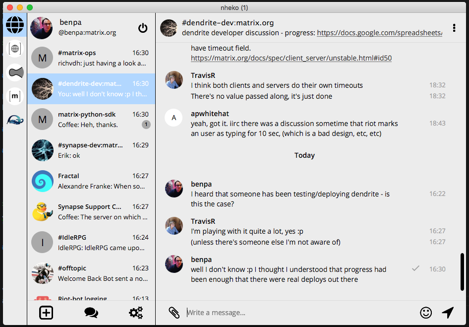Meanwhile the Python 3 port is progressing well (all sytests now pass in Python 3, i think!), and intrepid folks are starting to experiment with running it in production.