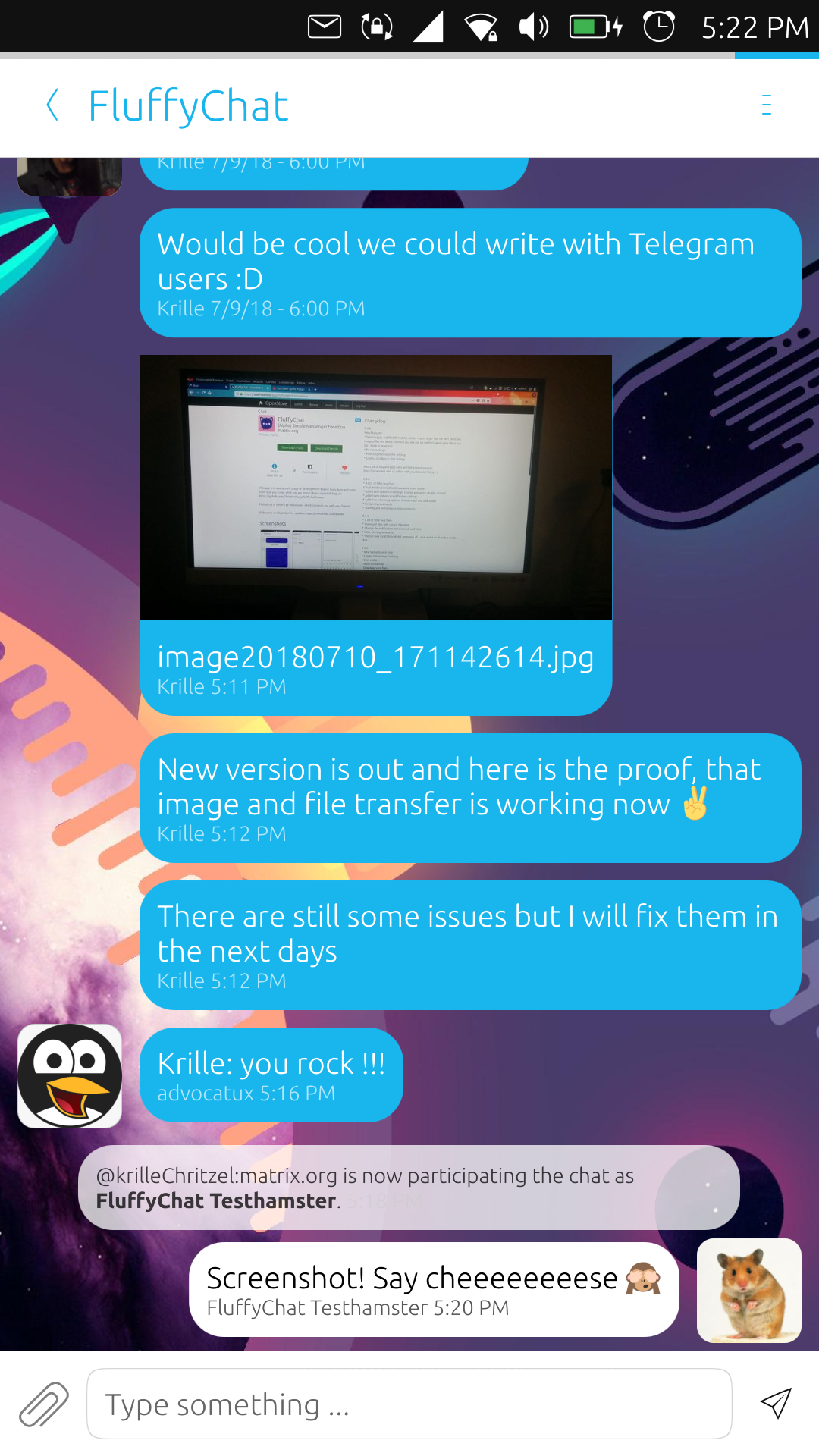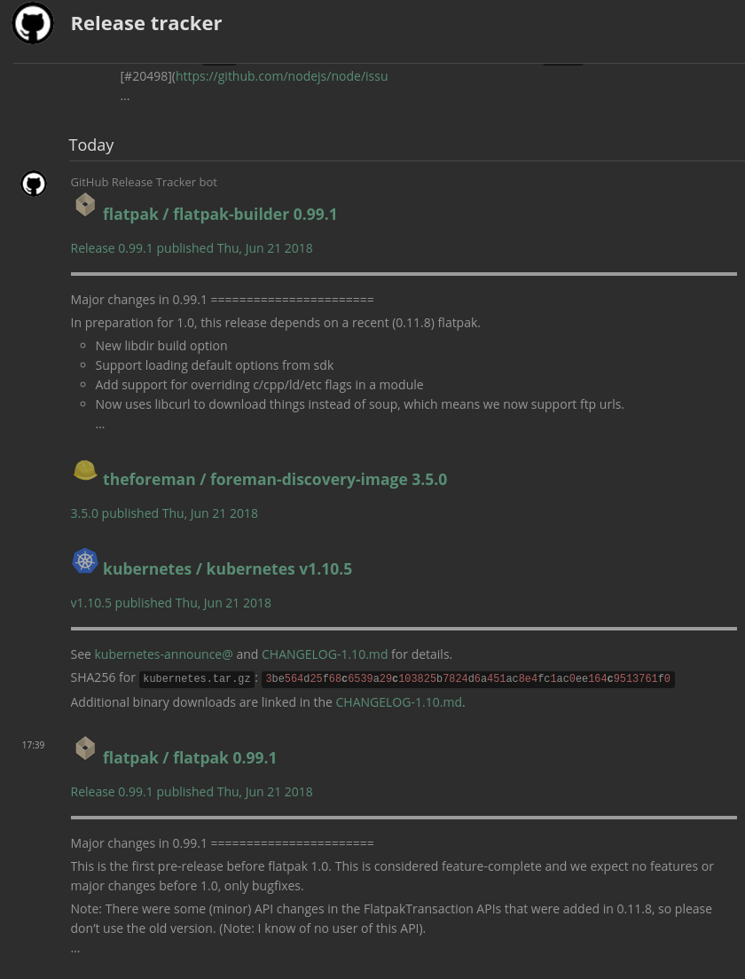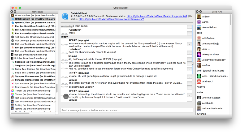 The result is the release of Client Server API version 0.4. This is a huge update - increasing the size of the CS API by ~40%. The biggest new stuff includes fully formalising support for end-to-end encryption (thanks to Zil0!), versioning for rooms (so we can upgrade rooms to new versions of the protocol), synchronised read markers, user directories, server ACLs, MSISDN 3rd party ids, and .well-known server discovery (not that it's widely used yet), but for the full picture, best bet is to look at the changelog (now managed by towncrier!). It's probably fair to say that the CS API is growing alarmingly large at this point - Chrome says that it'd be 223 A4 pages if printed. Our solution to this will be to refactor it somehow (and perhaps switch to a more compact representation of the contents).