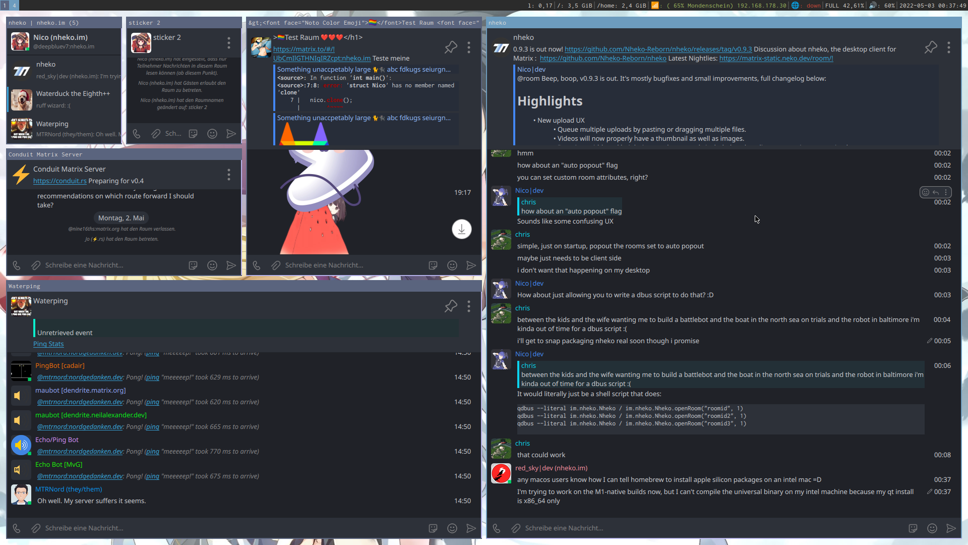 Good news, as you might have noticed, conduit.rs is back online and better than ever! Matrix.org is so kind and donates this Linux server to me. I already host a discord appservice and handle 23k messages per day and, most importantly, now I'm at the top of both #ping rooms ;)