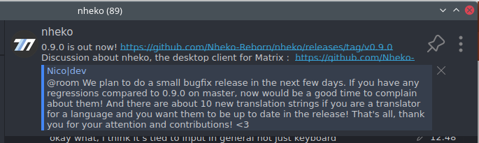In preparation for FOSDEM, I've also been working on some goodies so that you can participate using Nheko in a limited manner: