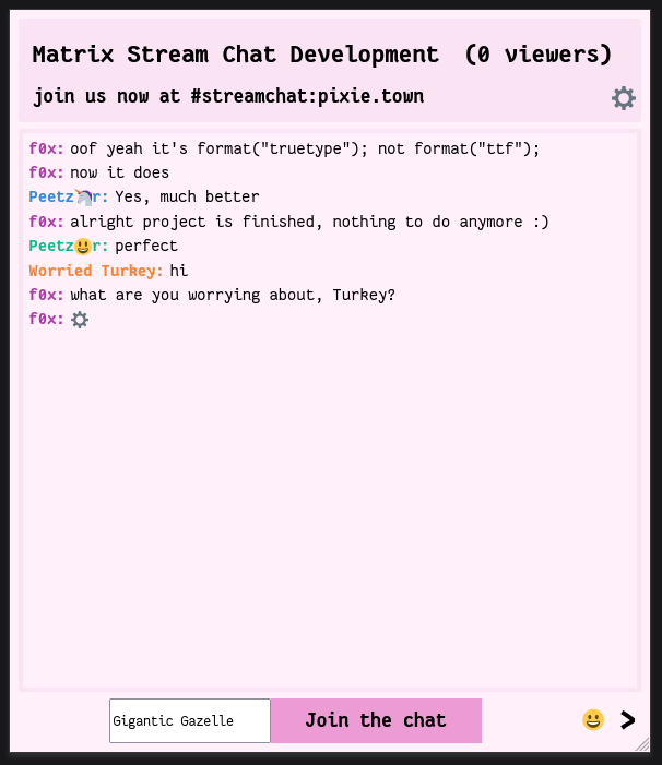 While this isn't grand, it should be good enough for some to participate using Nheko. You will need the latest master (some commits aren't even pushed at the time of writing!), but if you are just watching, this should give you an easy way to fetch the talk link for each room. You will still have to watch the actual talk in your browser though.