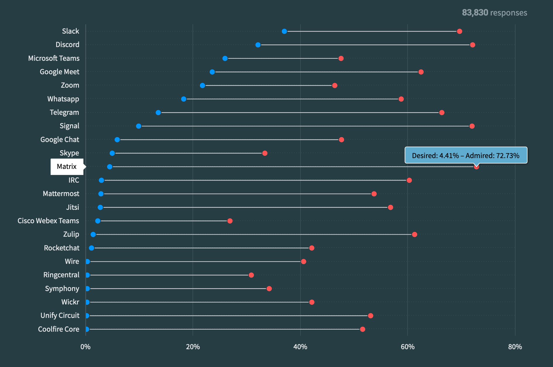 Of the 83,830 folks surveyed, Matrix was the #1 chat tool in terms of current users' satisfaction. It was also rated as the most desirable among the open source tools with open governance, but there is a lot of room for improvement in awareness. We’re excited to build on this 2024! 🚀