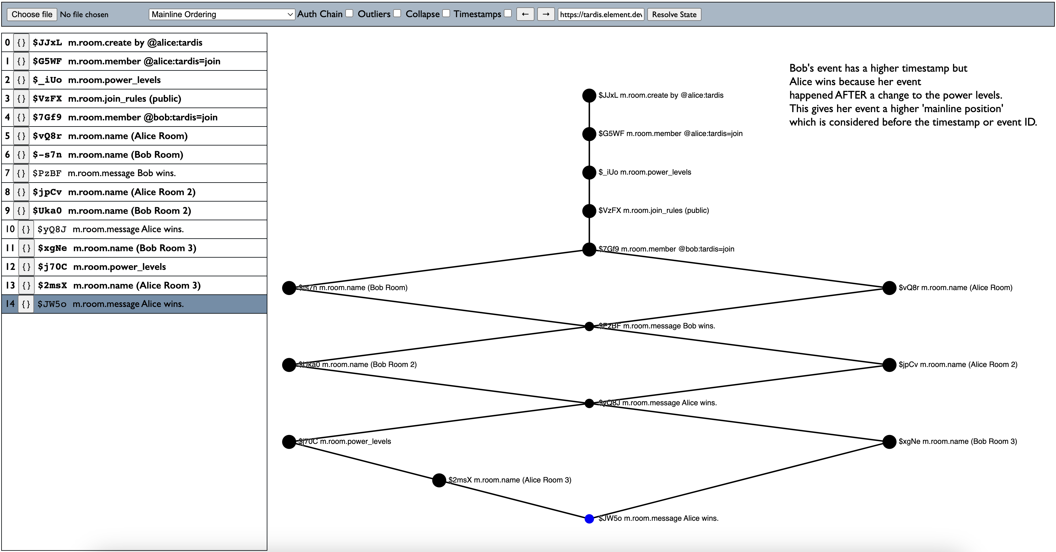 With that in mind, I recently spent some time working on a visualisation tool based on a project Matthew first wrote back in 2020 called TARDIS - Time Agnostic Room DAG Inspection Service. The backronym is surprisingly accurate. With this tool, you can step through "debugger-style" events in a room, seeing the shape of the DAG change. Originally this was all it could do, but I knew it could be so much more, so I set about prototyping the improvements I would make to it.