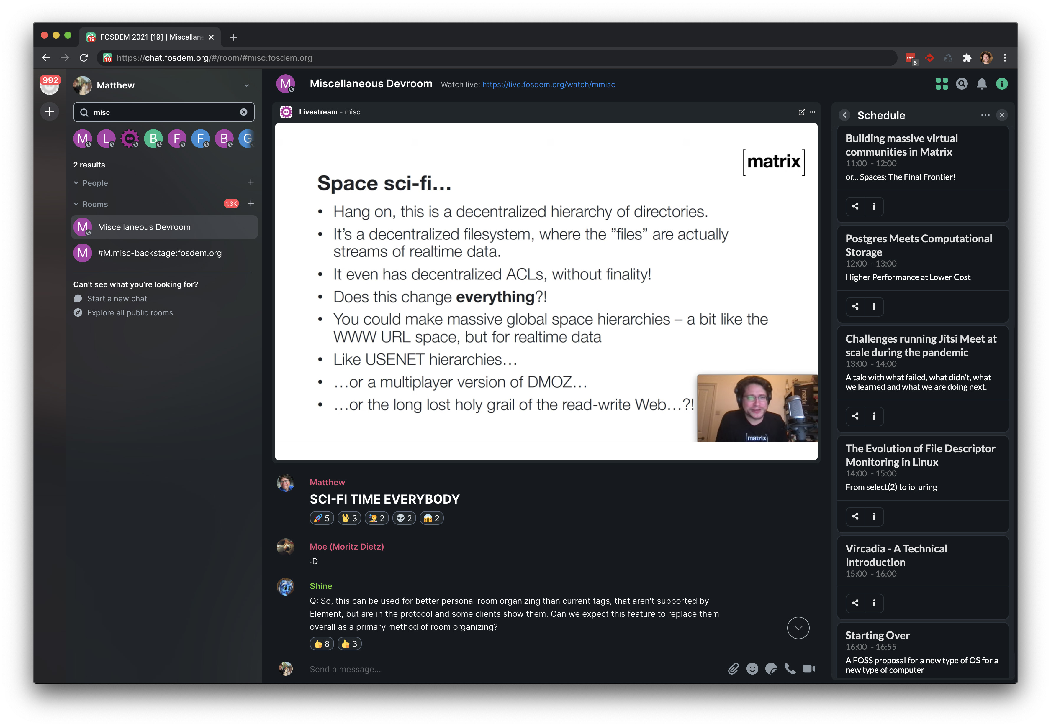The most unique thing about Matrix is that conversations get replicated across all servers whose users are present in the conversation, so there's never a single point of control or failure for a conversation (much as git repositories get replicated between all contributors). And so hosting FOSDEM in Matrix meant that everyone already on Matrix (including users bridged to Matrix from IRC, XMPP, Slack, Discord etc) could attend directly - in addition to users signing up for the first time on the FOSDEM server. Therefore the chat around FOSDEM 2021 now exists for posterity on all the Matrix servers whose users who participated; and we hope that the fosdem.org server will hang around for the benefit of all the newcomers for the foreseeable so they don't lose their accounts!