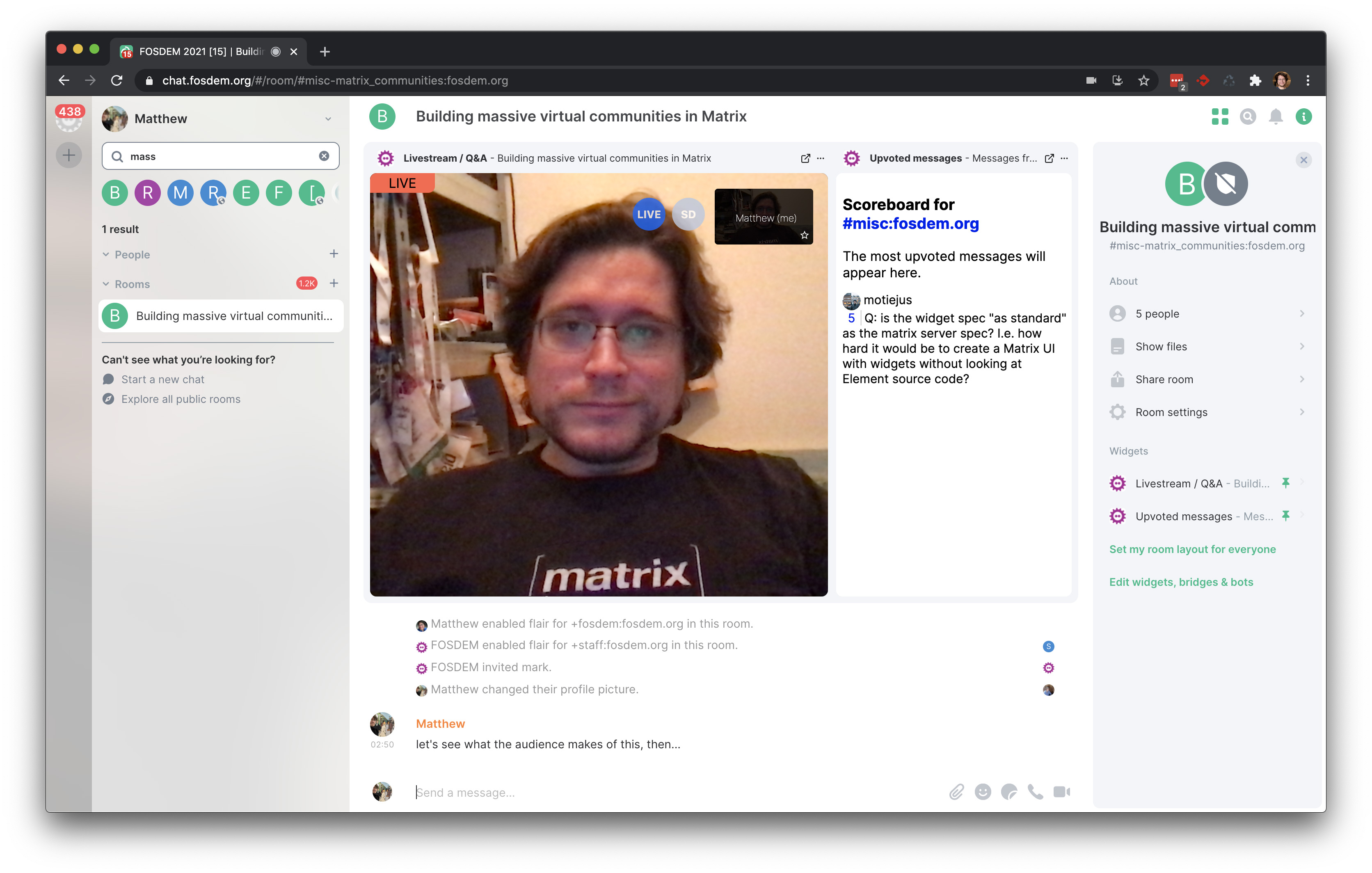 Another greatly appreciated feature was the famous “maximised widgets” I (Thib) keep telling you about in Matrix Live episodes. Attendees and speakers could give the conference the central attention it deserved while simultaneously keeping an eye on what was happening in the chat.