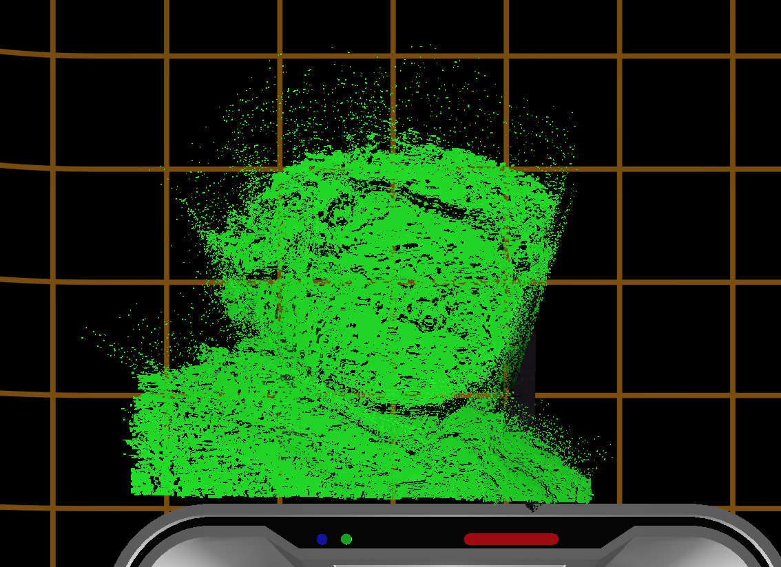 Step 5: Give up on the fancy depth encoding (for now): https://github.com/matrix-org/webrtc/commit/2f5d29352ce5d80727639991b1480f610cbdd54c.  In practice, simply picking a range of the 16-bit half-precision floats to fit in the integer range [0,255] turns out to be good enough for a quick demo (i.e. 8-bit depth buffer, but over a small subset of the 16-bit depth space) - the dot cloud suddenly looked a lot more 3D and recognisable: