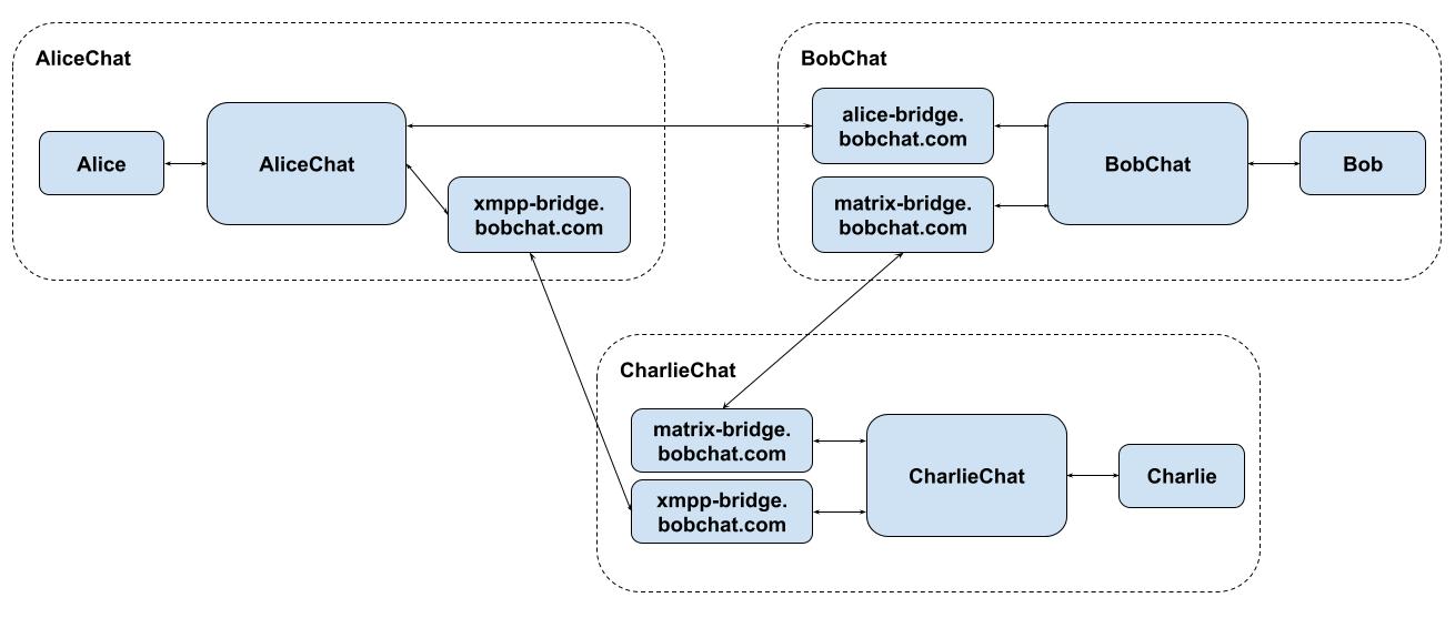are connected by Matrix bridges, and AliceChat and CharlieChat are connected