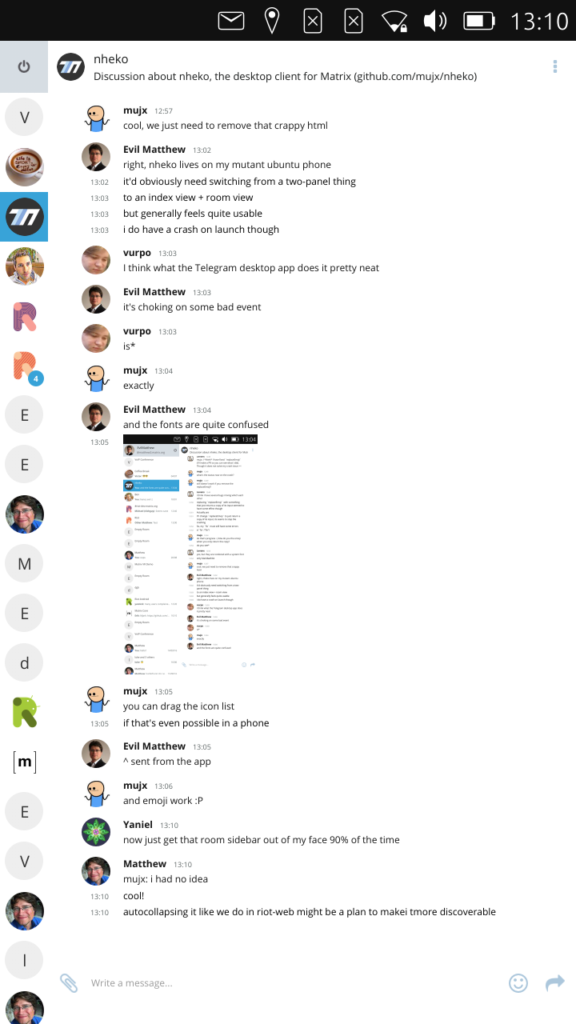 So the core problem of running a client like Nheko on Ubuntu Touch is that it uses lots of fun glossy stuff from Qt 5.9, whereas Ubuntu Touch is still on Qt 5.4, which is over 2 years old now. Also, it's been written as a desktop client so needs a bit of tuning to support a 'fat-finger' mobile form factor, although this is just a simple matter of programming and is a very similar problem to ensuring the desktop app has a nice responsive design on small screen window sizes (similar to how the telegram desktop client handles it). In the end, we focused on solving the Qt problem: building a custom Qt 5.9 for Ubports (the community project who do a fantastic job of continuing Ubuntu Touch development since Canonical pulled out), while for simplicity building it on top of the current ubports distribution (which is effectively still Ubuntu 15.04). The reason for all this Ubuntu stuff rather than using PureOS is simply that it's not far enough along, and we don't physically have a Librem5 dev kit yet to play with!