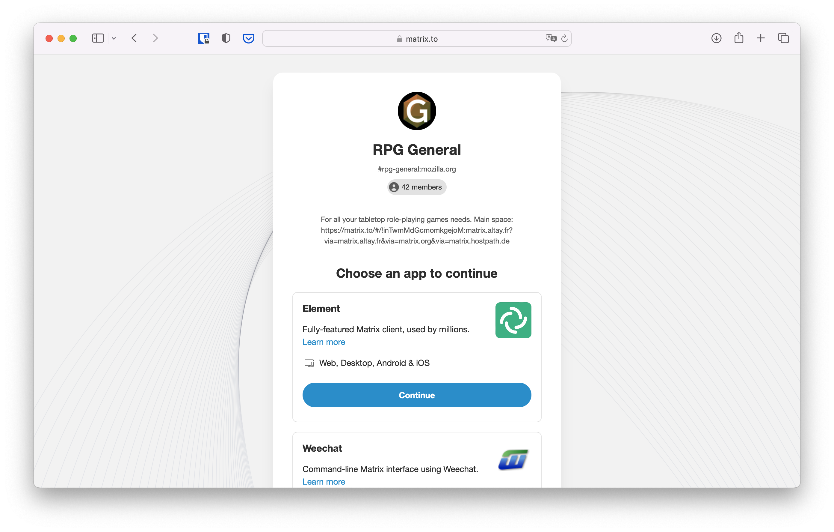 Click on "Continue" below Element. If you have installed Element Desktop, your browser may ask you if you want to allow this page to open Element. Click on Allow. If you haven't installed Element Desktop, you can either click on "Download" to get it, or "Continue in your browser" to carry on with the web app.